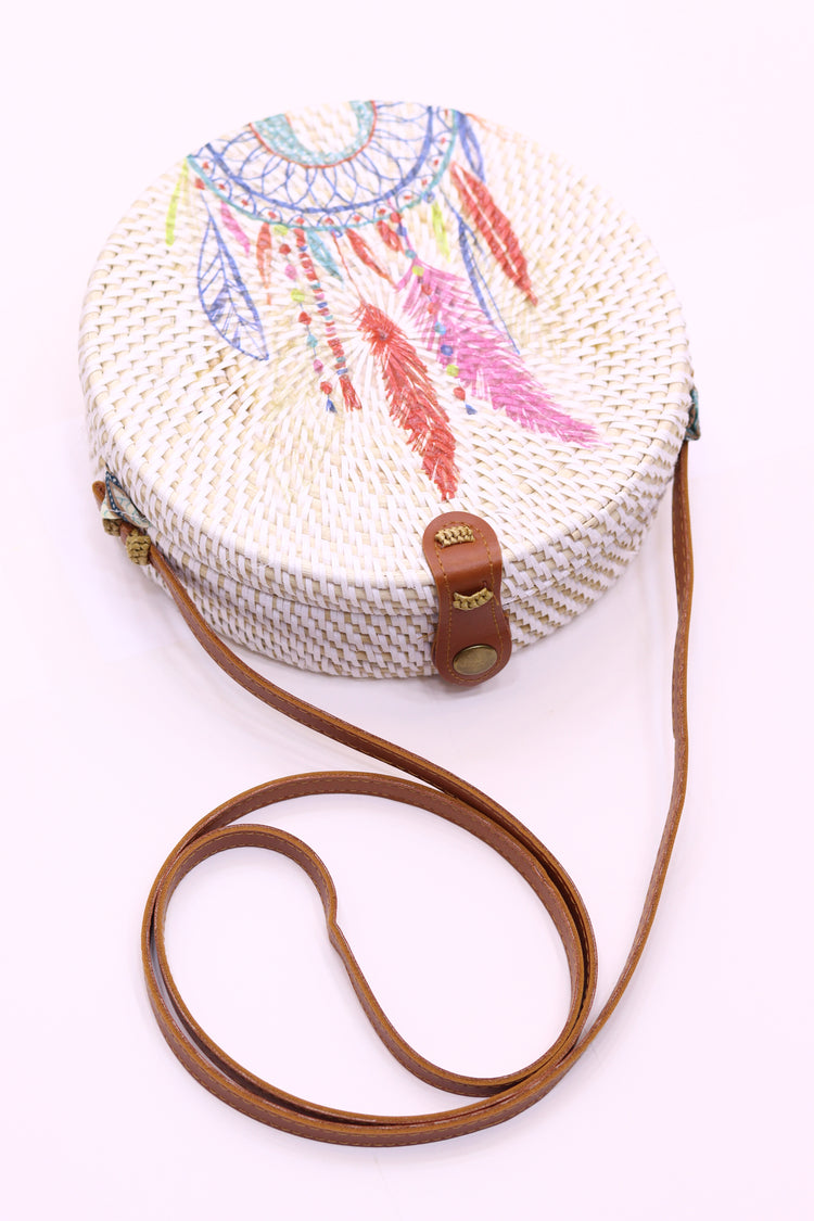 Cute Handwoven Round Rattan Bag Shoulder Leather Straps Natural Chic RB-15